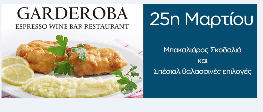 25η Μαρτίου μετά την παρέλαση σας προσκαλούμε στο Garderoba για παραδοσιακό μπακαλιάρο με σκορδαλιά και σπέσιαλ θαλασσινά πιάτα!