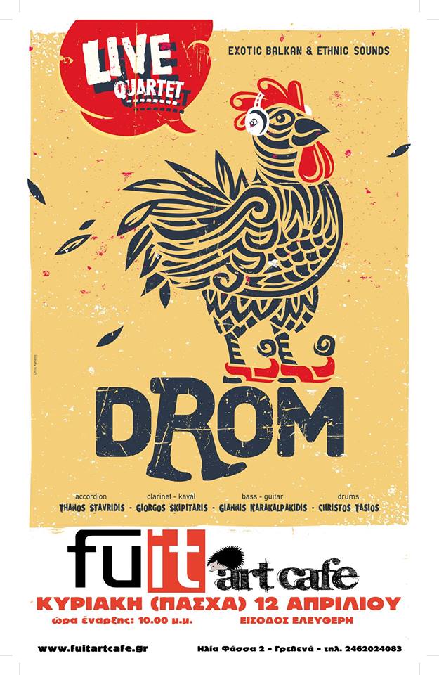 ΚΥΡΙΑΚΗ ΠΑΣΧΑ με dROM live στο fuit art cafe. Ένα μουσικό σχήμα με ήχους, χρώματα κι αρώματα από την Βαλκανική. Μουσικές ξεσηκωτικές που μας ταξιδεύουν απ’ τον καιρό των τσιγγάνων ως το σήμερα. Ένα ταξίδι από την Ήπειρο στο Βουκουρέστι με ενδιάμεσες στάσεις στη Θεσσαλονίκη, στα Σκόπια, τη Σόφια, το Βελιγράδι και πάλι πίσω, με πολύ κέφι κι ενέργεια. Κλαρίνο, καβάλ, ακορντεόν, κιθάρες και νταούλια το όχημα. Δέστε τις ζώνες ασφαλείας σας και…το ταξίδι ξεκινά.