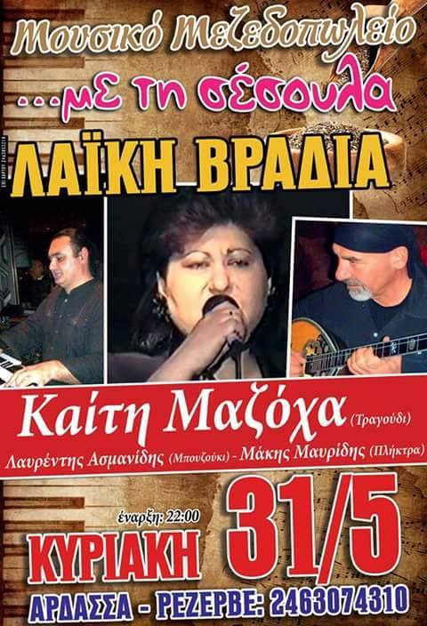 Λαϊκή βραδιά με την Καίτη Μαζόχα στο Μουσικό Μεζεδοπωλείο “…με τη σέσουλα” στην Άρδασσα Εορδαίας, την Κυριακή 31/5