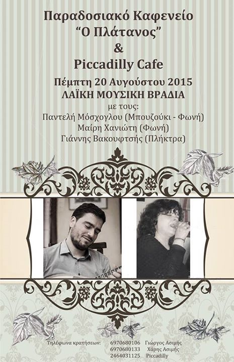 Λαϊκή μουσική βραδιά στο Παραδοσιακό Καφενείο “Ο Πλάτανος” & Piccadilly cafe στο Βελβεντό, την Πέμπτη 20 Αυγούστου