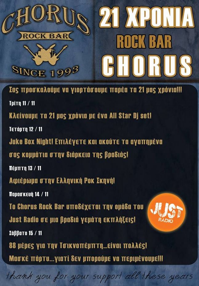21 χρόνια Chorus Rock Bar στην Κοζάνη – Έναρξη events από 11/11. Δείτε την παρακάτω αφίσα…