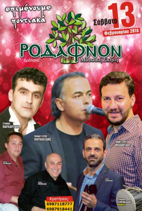 Σας περιμένουμε και αυτό το Σάββατο 13 Φεβρουαρίου στο μοναδικό στέκι της ποντιακής διασκέδασης για μια αξέχαστη βραδιά.Το πρόγραμμα πλαισιώνουν οι εξής καλλιτέχνες :