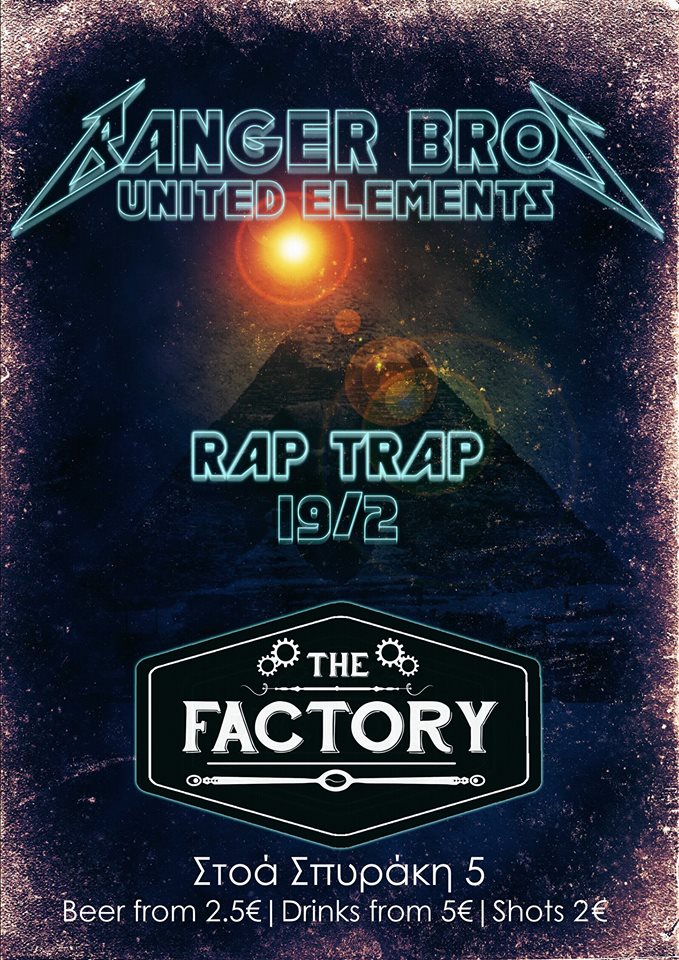 Οι United Elements παρουσιάζουν τους Banger Bros για ένα μοναδικό πάρτυ στο The Factory (Φλώρινα).Οι Banger Bros είναι ένα νέο DJ-duo και μέλη του είναι οι Dollabill και Kazaam. Ο ήχος των Banger Bros κινείται ανάμεσα σε trap-edm αλλά βασισμένο πάντα στον rap χαρακτήρα του σχήματος.