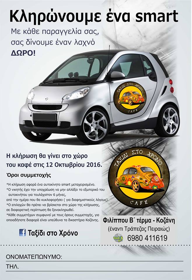To cafe “Ταξίδι στο χρόνο” στην Κοζάνη, κληρώνει ένα αυτοκίνητο! Με κάθε παραγγελία σας δίνουνε έναν λαχνό για να συμμετέχετε στην κλήρωση.Η κλήρωση θα πραγματοποιηθεί την Τετάρτη 12 Οκτωβρίου.