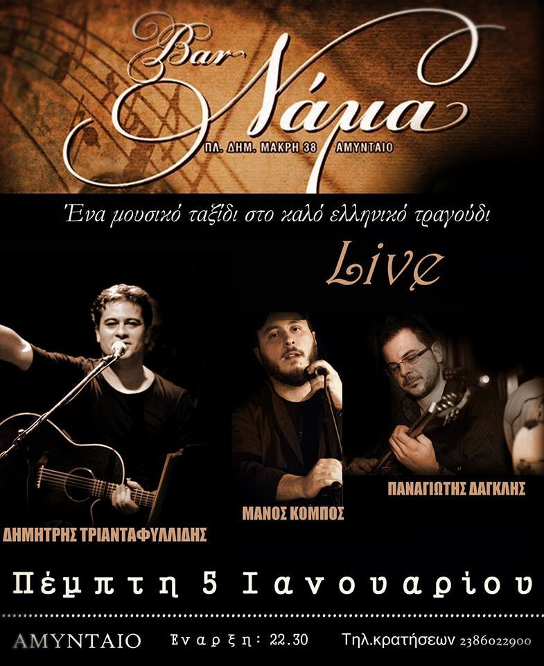 Μουσικό ταξίδι στο ελληνικό τραγούδι στο bar Nάμα στο Αμύνταιο, την Πέμπτη 5 Ιανουαρίου .