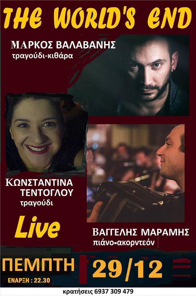 Live με τον Μ.Βαλαβάνη & την Κ.Τεντόγλου στο “The world’s end” στην Πτολεμαΐδα, την Πέμπτη 29 Δεκεμβρίου