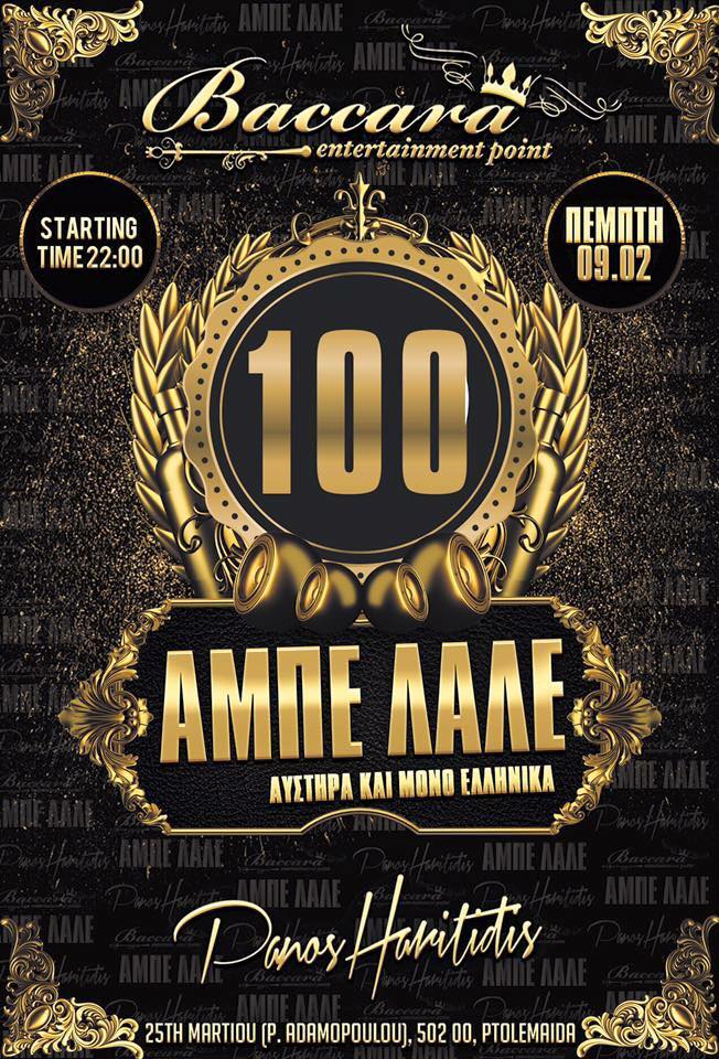 Το Baccara bar στην Πτολεμαΐδα, γιορτάζει 100 “ΑΜΠΕ ΛΑΛΕ” με τον Pano Haritidi, την Πέμπτη 9 Φεβρουαρίου