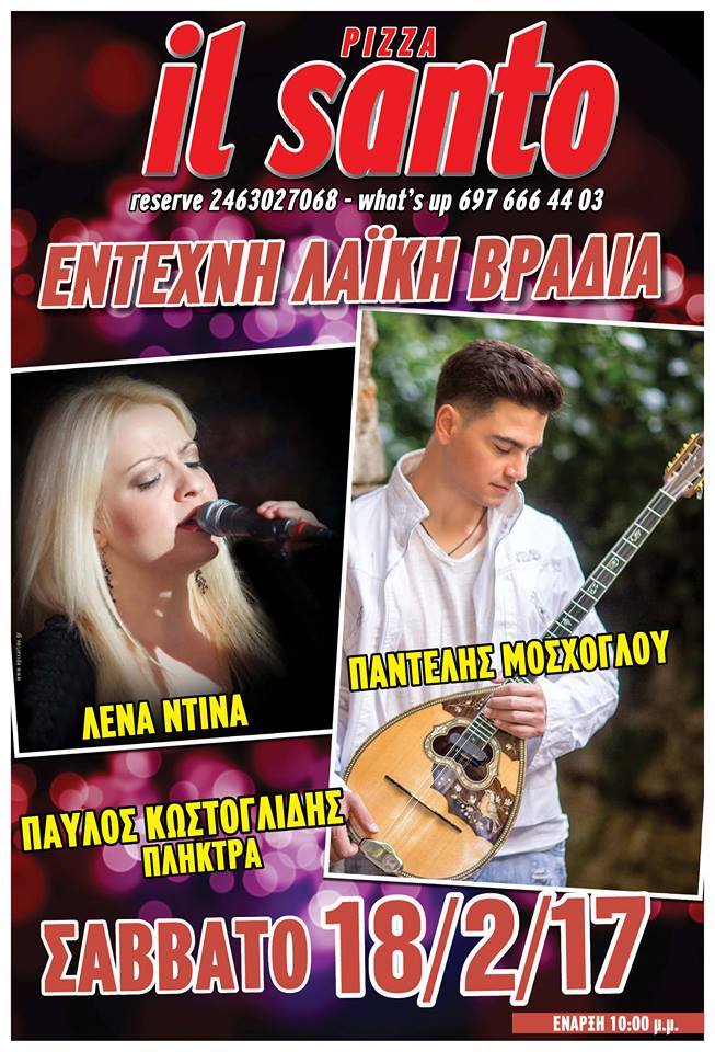 Έντεχνη λαϊκή βραδιά στην pizza il santo στην Πτολεμαΐδα, το Σάββατο 18 Φεβρουαρίου