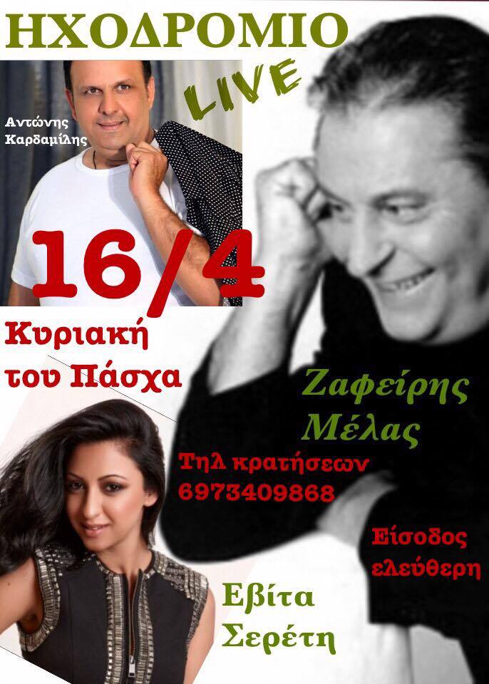 Ο Ζαφείρης Μελάς live στο Ηχοδρομίο στα Γρεβενά, την Κυριακή του Πάσχα 16 Απριλίου .