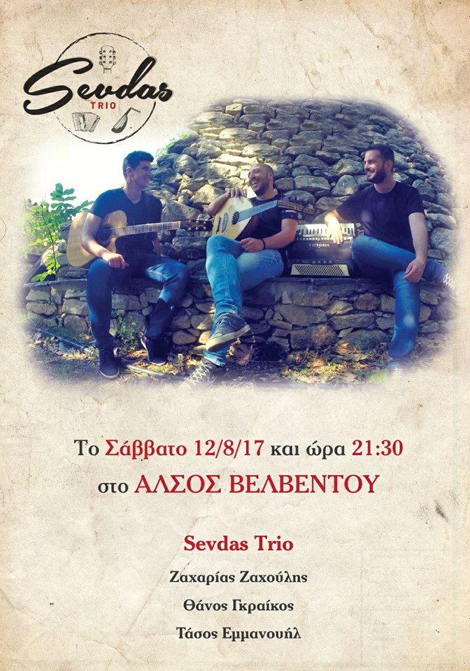 Sevdas trio live στο Άλσος Βελβεντού το Σάββατο 12 Αυγούστου .