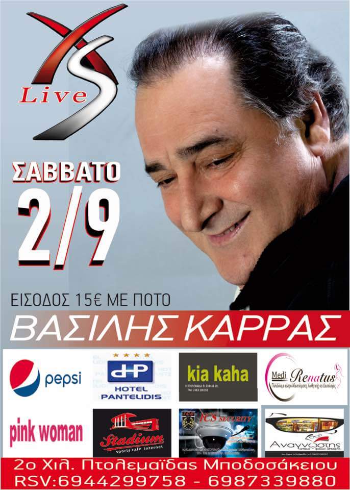 O Βασίλης Καρράς το Σάββατο 2 Σεπτεμβρίου στο live Xs στην Πτολεμαΐδα .