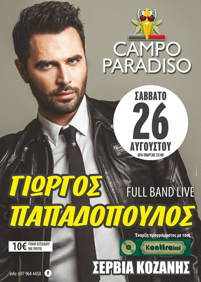 Ο Γιώργος Παπαδόπουλος Live full band Στο Campo Paradiso … Open act Konttra band… Τιμή εισόδου 10 ευρώ.. Δεύτερο ποτό 7 απλό 8 σπέσιαλ. Φιάλη 70 απλή 80 σπέσιαλ. Open doors at. 00:01 be there..