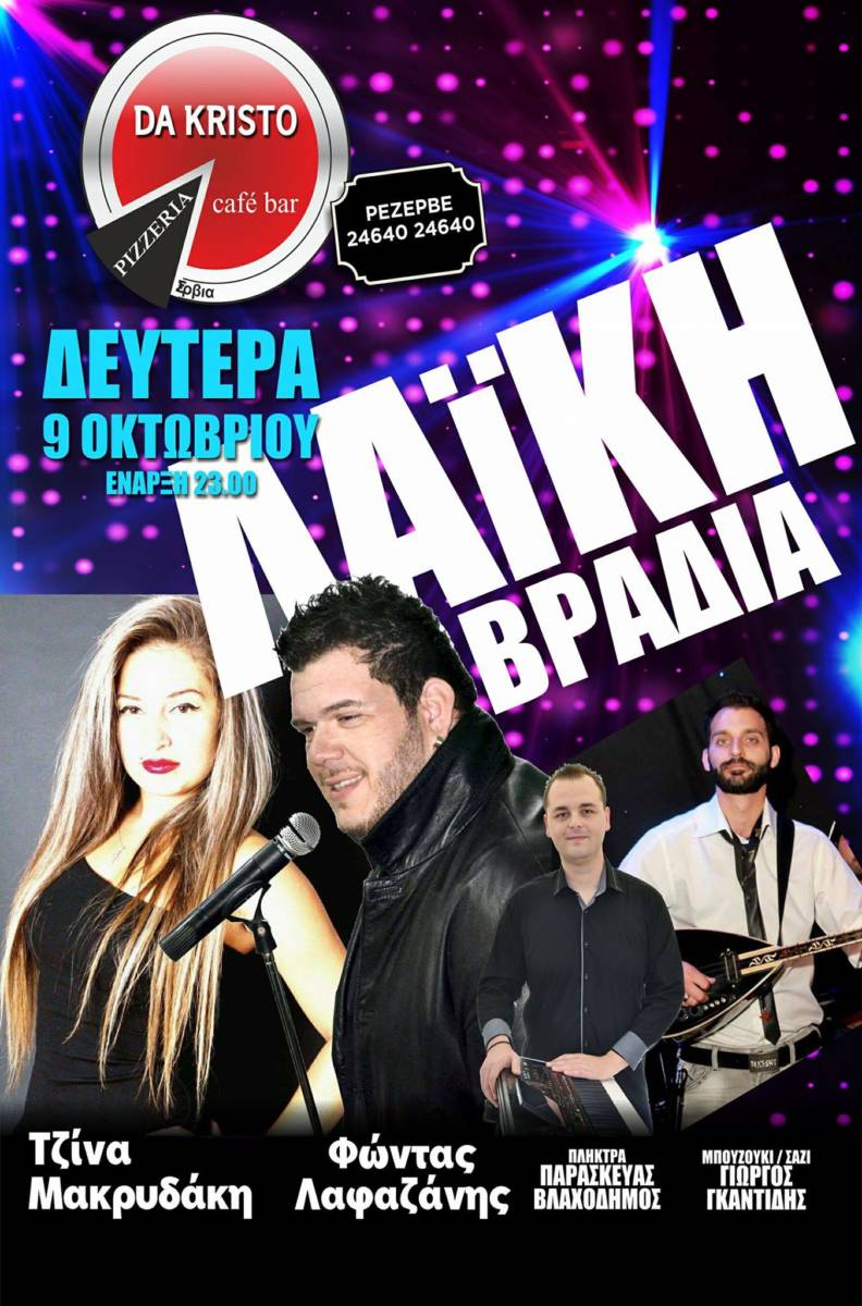 Ζωντανή λαϊκή βραδιά, τη Δευτέρα 9 Οκτωβρίου, στο Da kristo στα Σέρβια .
