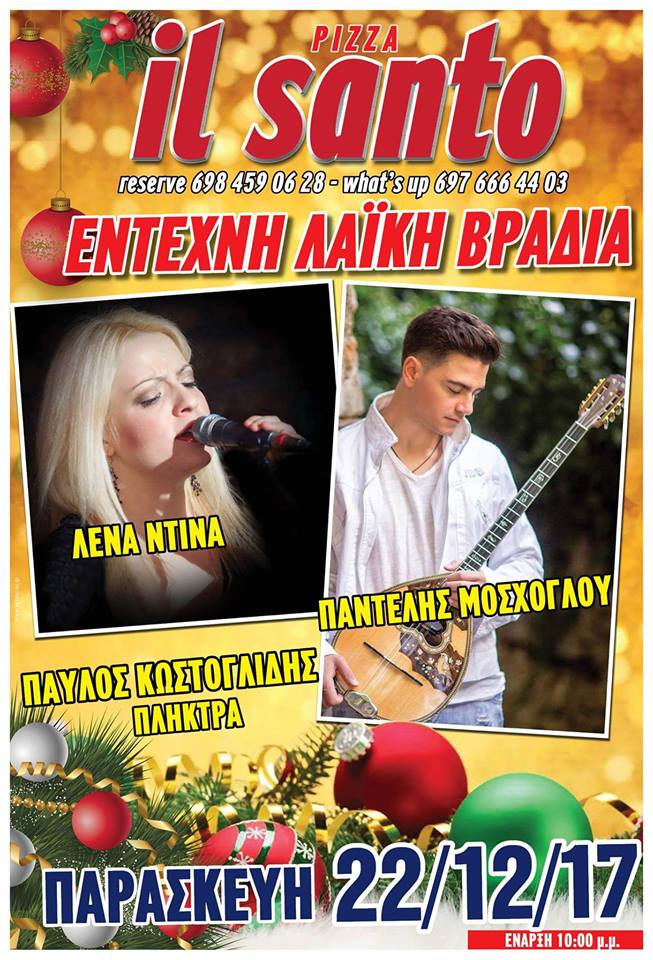 Έντεχνη λαϊκή βραδιά στην πιτσαρία Il santo στην Πτολεμαΐδα, την Παρασκευή 22 Δεκεμβρίου .