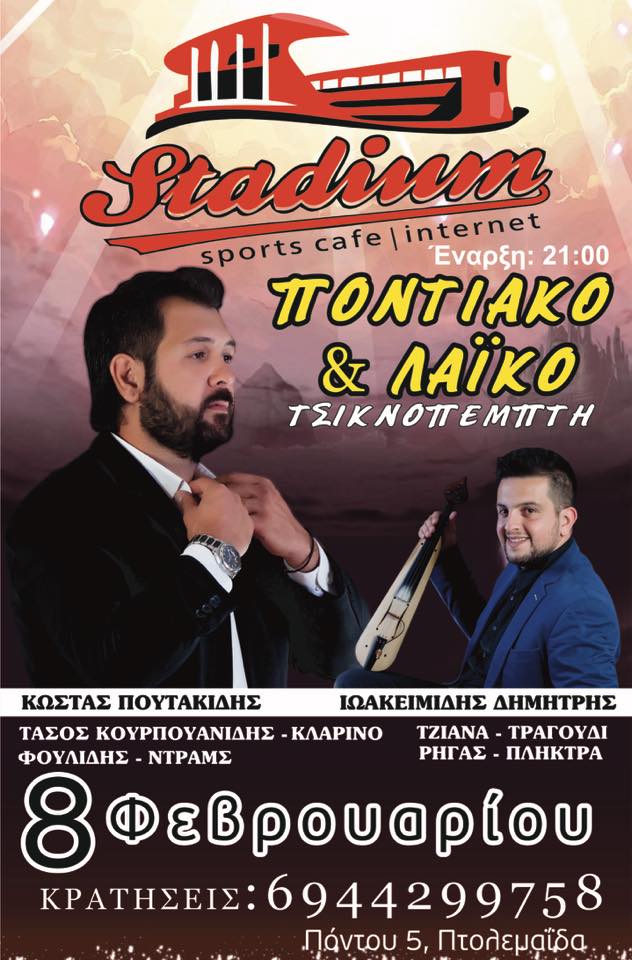 Ποντιακό και Λαϊκό γλέντι το βράδυ της Τσικνοπέμπτης στο Stadium στην Πτολεμαΐδα .