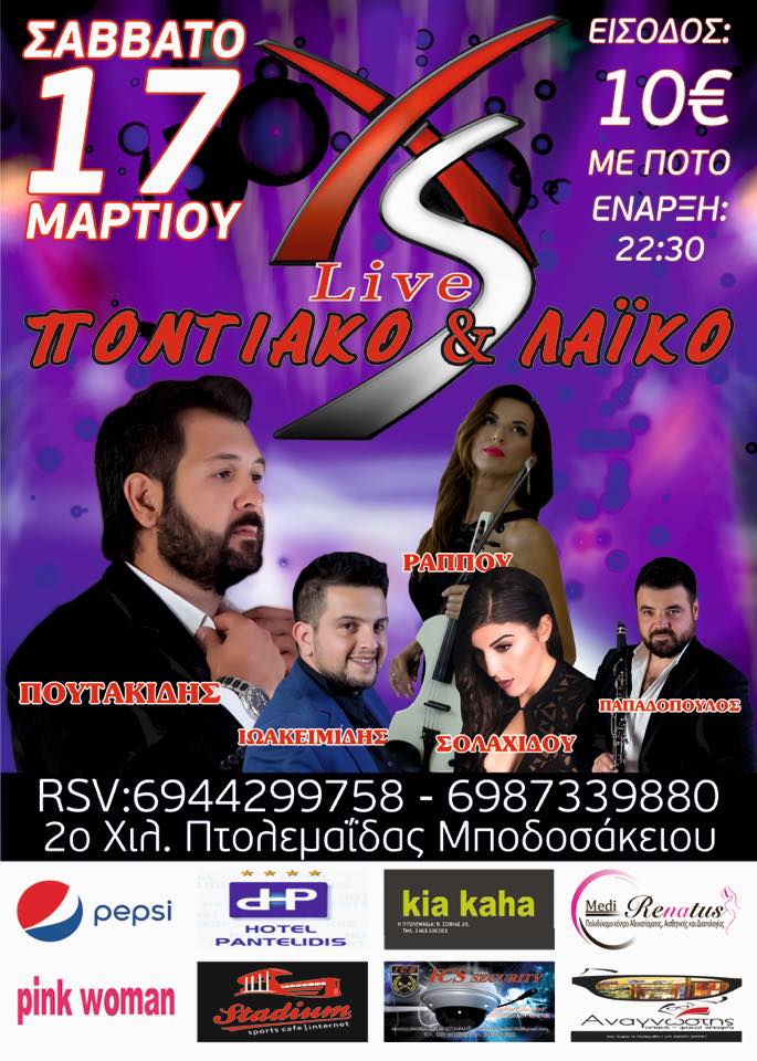 Ποντιακό και λαϊκό γλέντι στο Xs live στην Πτολεμαΐδα, το Σάββατο 17 Μαρτίου .