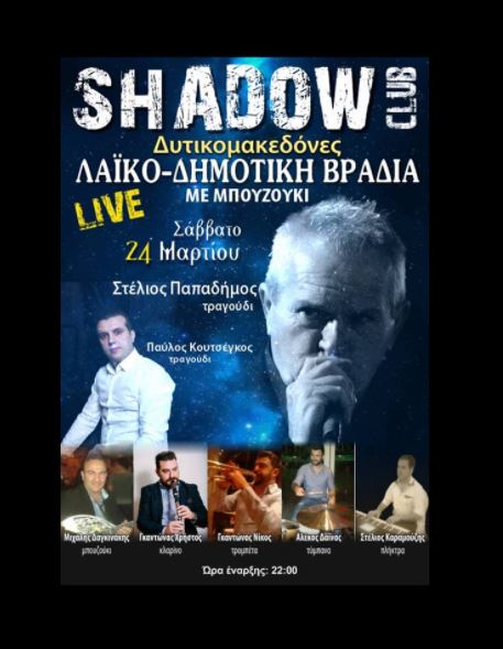 Ζωντανή Λαϊκή Δημοτική βραδιά στο club Shadow στην Γαλατινή, το Σάββατο 24 Μαρτίου