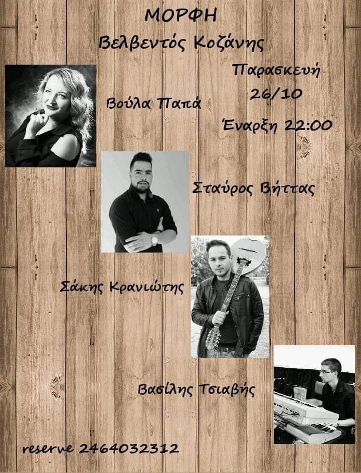 Ζωντανή μουσική βραδιά στο cafe Μορφή στο Βελβεντό, την Παρασκευή 26 Οκτωβρίου .