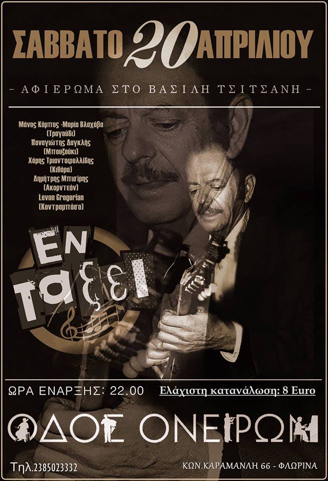 Μια ζωντανή μουσική αναδρομή και διαδρομή, στο έργο του αναμορφωτή του Ρεμπέτικου & θεμελιωτή της λαικής μουσικής. Οι μουσικές του Βασίλη Τσιτσάνη ζωντανεύουν κι έρχονται να μας σεργιανίσουν στις στράτες του ρεμπέτικου & λαϊκού μας τραγουδιού. Τραγούδια που ο χρόνος δεν άγγιξε, τραγούδια που συγκινούν και συνεχίζουν να εμπνέουν και να ψυχαγωγούν όλους μας. Ζωντανά με τους Εν Τάξει στη Φλώρινα – στην “ΟΔΟ ΟΝΕΙΡΩΝ” το Σάββατο 20 Απριλίου στις 10 το βράδυ.
