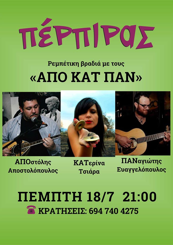 Ρεμπέτικη βραδιά με τους “ΑΠΟ ΚΑΤ ΠΑΝ” την Πέμπτη 18/7 στις 9:00μ.μ. στον Πέρπιρα! Κρατήσεις: 694 740 4275.