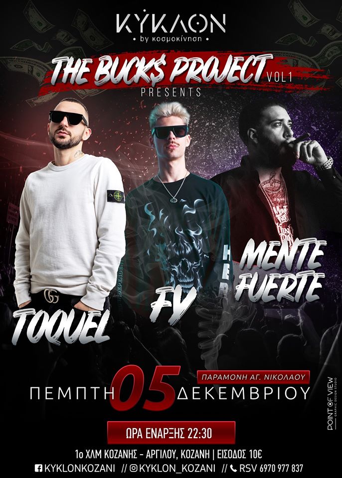 The bucks project presents TOQUEL, FY, MENTE FUERTE, την Πέμπτη 5 Δεκεμβρίου στο ΚΥΚΛΟΝ στην Κοζάνη .