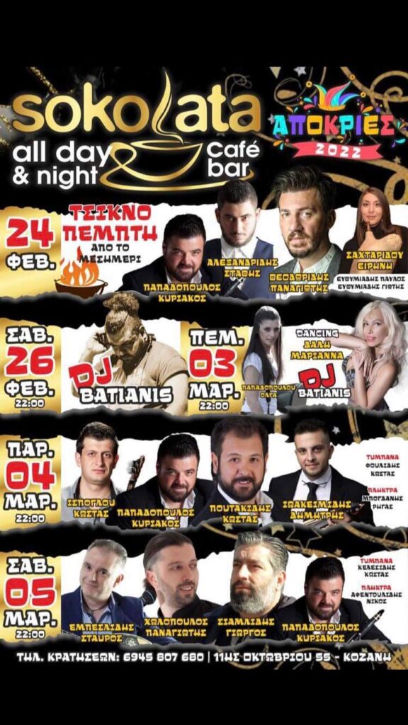 Ζωντανή μουσική και DJs στο αποκριάτικο πρόγραμμα του cafe bar Sokolata στην Κοζάνη .