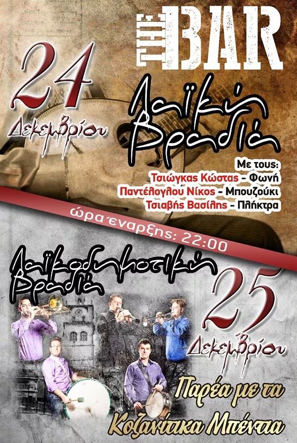 The bar κοζάνη: Λαϊκή βραδιά 24/12- Λαϊκοδημοτική βραδιά με “Κοζανίτικα μπέντια” 15/12