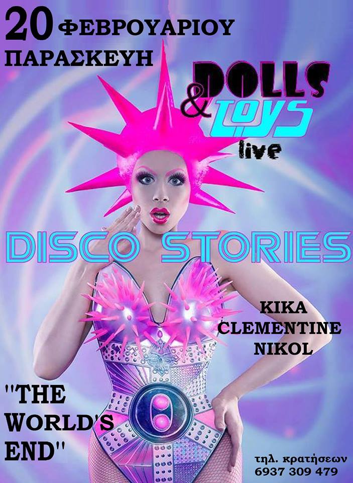 Dress up and show up στο πιο hot DISCO/POP PARTY με τις καλύτερες χορευτικές μουσικές επιλογές από τα 70’s – 80’s & 90’s . Πλήκτρα , δύο βιολιά και τρείς φωνές από τις εκθαμβωτικές dolls KIKA , CLEMENTINE και NIKOL , ζωντανεύουν την αγαπημένη εποχή της discoμπάλας και όχι μόνο , σε ένα μοναδικό cult show – ταξίδι στο χρόνο και τη νοσταλγικά όμορφη τρέλα της disco !!
