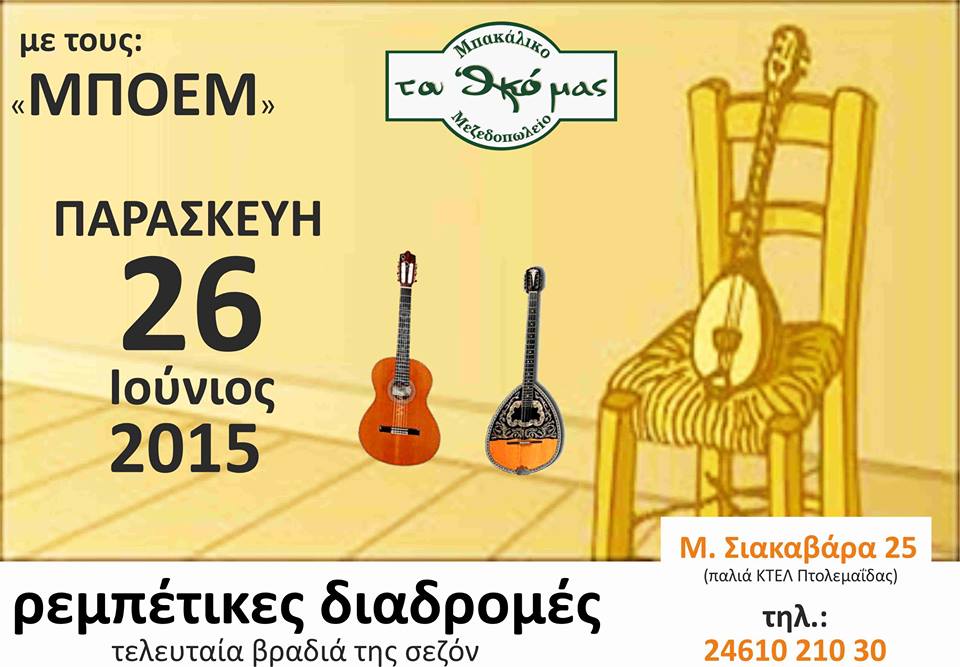 Ρεμπέτικη βραδιά με τους Μποέμ στο Μεζεδοπωλείο “Του θκο μας” στην Κοζάνη την Παρασκευή 26 Ιουνίου