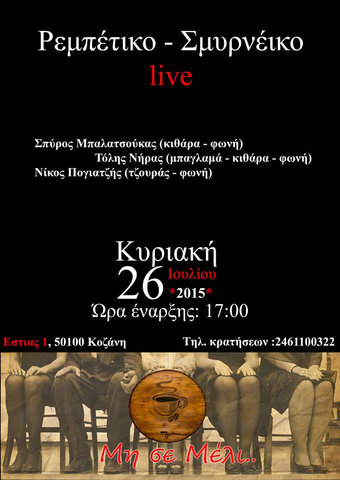 Ρεμπέτικο-Σμυρνέικο live, στο “Μη σε μέλι”, στην Κοζάνη την Κυριακή 26 Ιουλίου