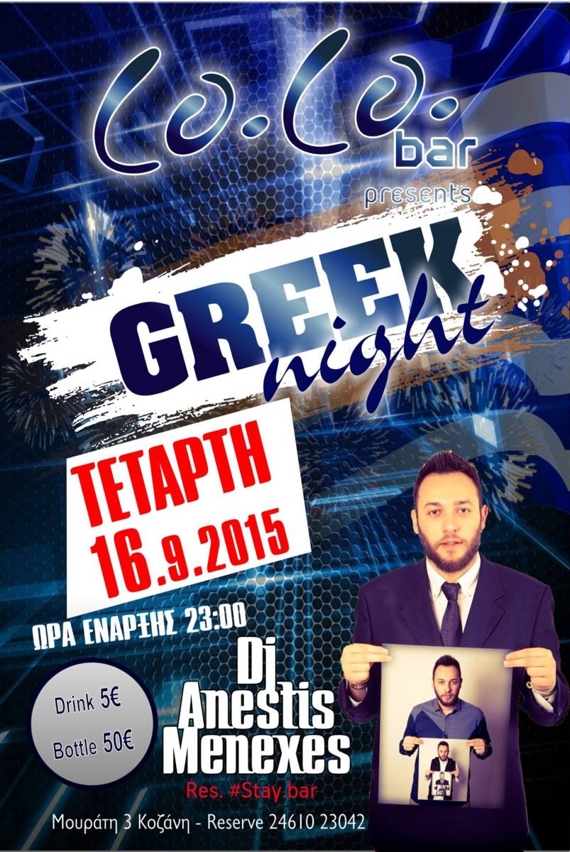 Co.Co bar Κοζάνη presents “Greek night”, dj Anestis Menexes, την Τετάρτη 16 Σεπτεμβρίου