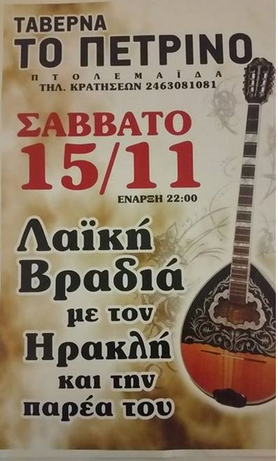 Λαϊκή βραδιά στην ταβέρνα “Πέτρινο” στην Πτολεμαϊδα , το Σάββατο 15 Νοεμβρίου