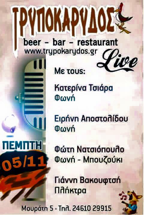 Ζωντανή μουσική στο beer bar restaurant Τρυποκάρυδος στην Κοζάνη, την Πέμπτη 5 Νοεμβρίου
