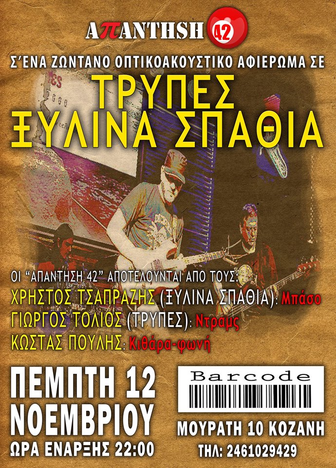 Barcode bar Κοζάνη: Live Αφιέρωμα σε Ξύλινα σπαθιά -Τρύπες την Πέμπτη 12 Νοεμβρίου