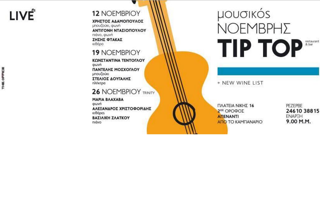 ΤΟ TIP TOP ΣΑΣ ΠΡΟΣΚΑΛΕΙ ΣΤΙΣ 12,19 ΚΑΙ 26 ΝΟΕΜΒΡΙΟΥ ΣΤΙΣ ΖΩΝΤΑΝΕΣ ΜΟΥΣΙΚΕΣ ΒΡΑΔΙΕΣ ΠΟΥ ΔΙΟΡΓΑΝΩΝΕΙ.