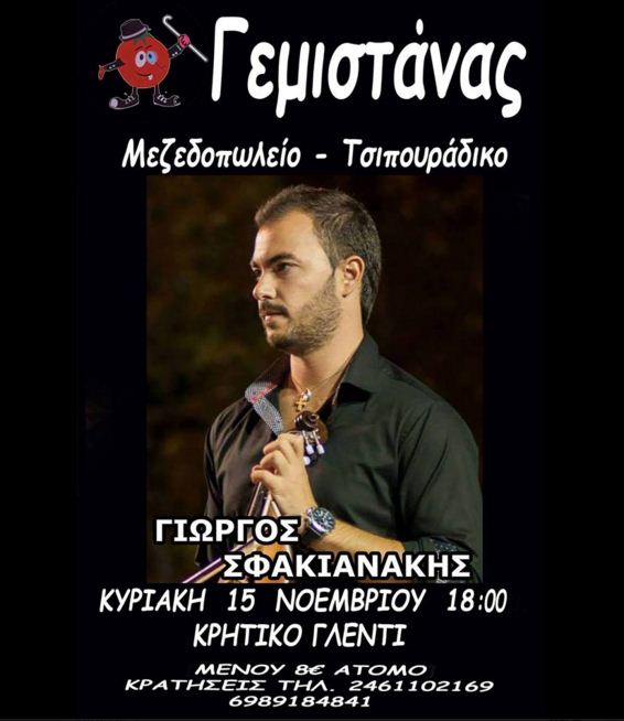 Κρητικό γλέντι με τον Γιώργο Σφακιανάκη στο Μεζεδοπωλείο Γεμιστάνας,στην Κοζάνη, την Κυριακή 15 Νοεμβρίου.