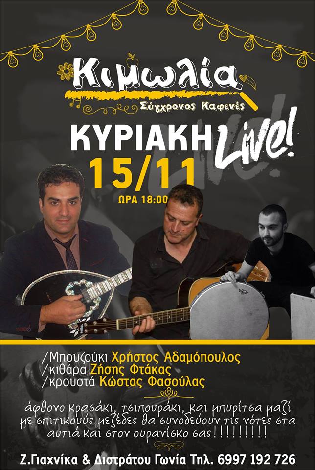 Ζωντανή μουσική, Κυριακή,15 Νοεμβρίου, απόγευμα, στον σύγχρονο καφενέ “Κιμωλία” στην Κοζάνη.