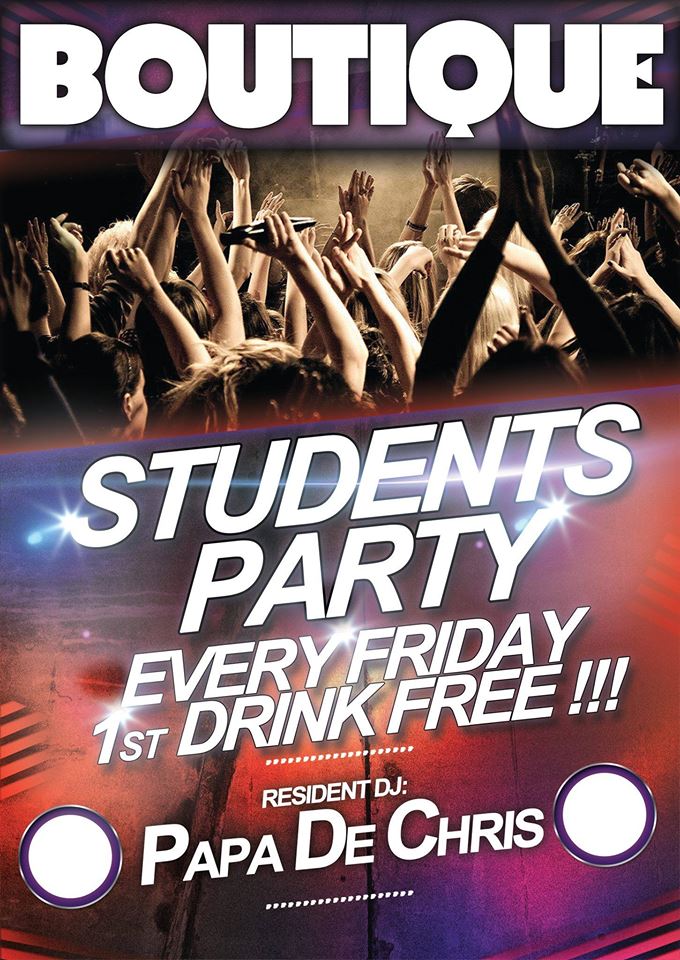 Αυτή την Παρασκευή 27 Νοεμβρίου και κάθε Παρασκευή διασκεδάζουμε μαζί με τους φοιτητές της πολης μας!!Στην μουσικη επιμελεια ο Resident Dj ”Papa De Chris”