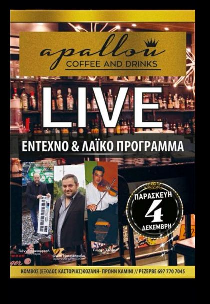 Live έντεχνο και λαϊκό πρόγραμμα στο cafe Apallou στην Κοζάνη, την Παρασκευή 4 Δεκεμβρίου