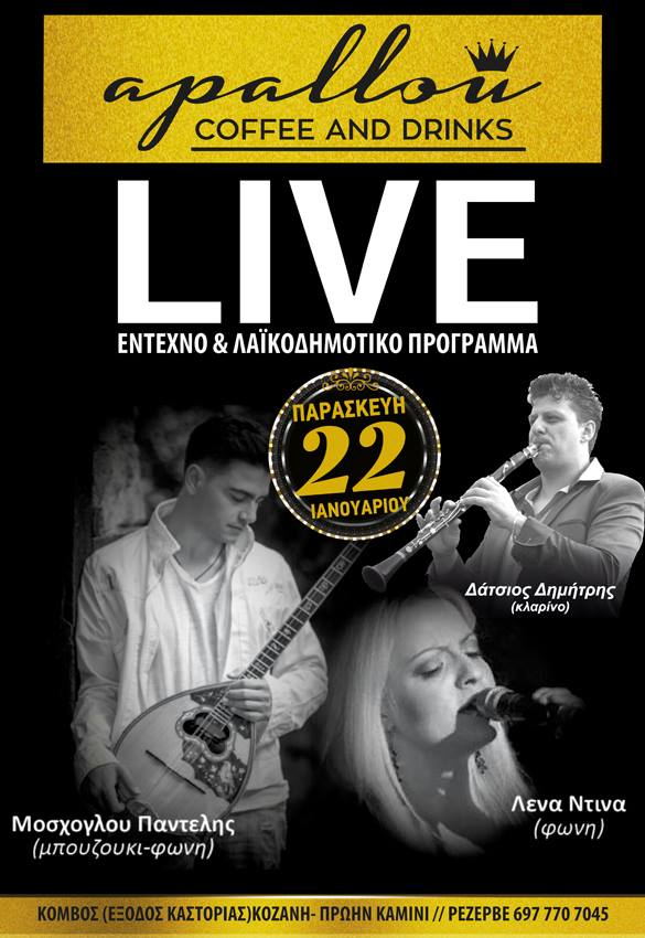 Live με έντεχνο & λαϊκοδημοτικό πρόγραμμα στο apallou στην Κοζάνη, την Παρασκευή 22 Ιανουαρίου