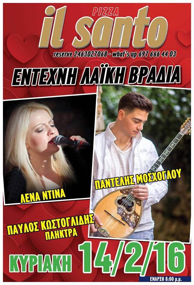 Έντεχνη λαϊκή βραδιά στην Pizza il santo στην Πτολεμαϊδα με τους: Λένα Ντίνα (τραγούδι) , Παντελή Μόσχογλου (μπουζούκι) και Παύλο Κωστογλίδη (πλήκτρα), την Κυριακή 14 Φεβρουαρίου