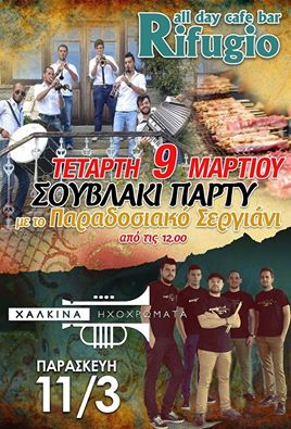 Σουβλάκι πάρτι με το “Παραδοσιακό Σεργιάνι”, την Τετάρτη 9 Μαρτίου.Την Παρασκευή 11 Μαρτίου τα Χάλκινα Ηχοχρώματα