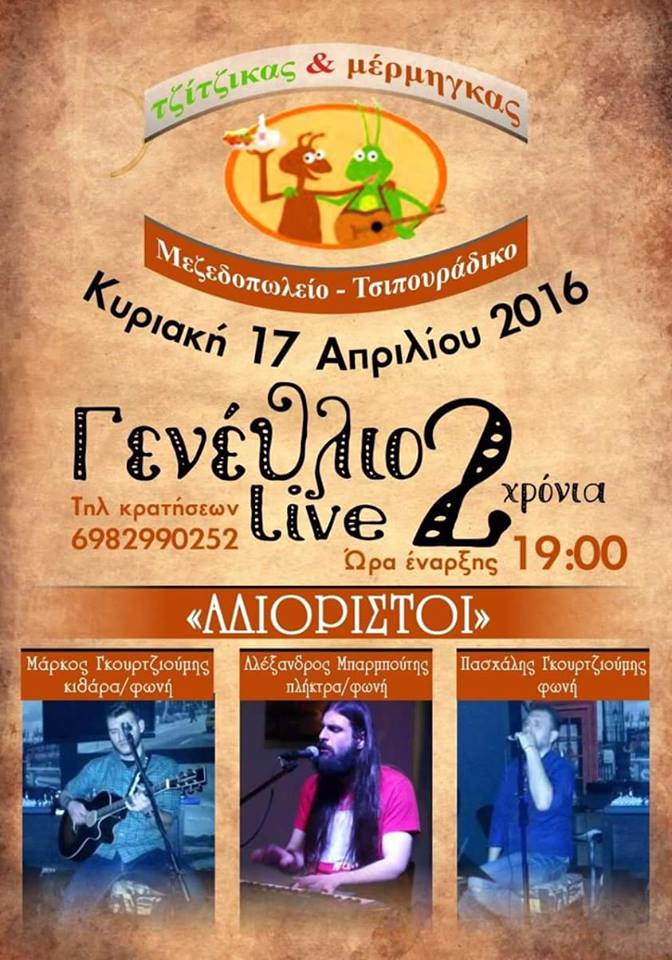 Γενέθλιο Live, 2 χρόνια μεζεδοπωλείο-Τσιπουράδικος Τζίτζικας & Μέρμηγκας στην Κοζάνη, την Κυριακή 17/4