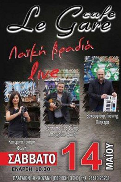 Ζωντανή λαϊκή βραδιά στο cafe Le Gare στην Κοζάνη, το Σάββατο 14 Μαΐου
