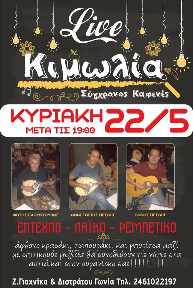 Έντεχνο, λαϊκό, ρεμπέτικο Live στον Καφενέ Κιμωλία στην Κοζάνη, την Κυριακή 22/5