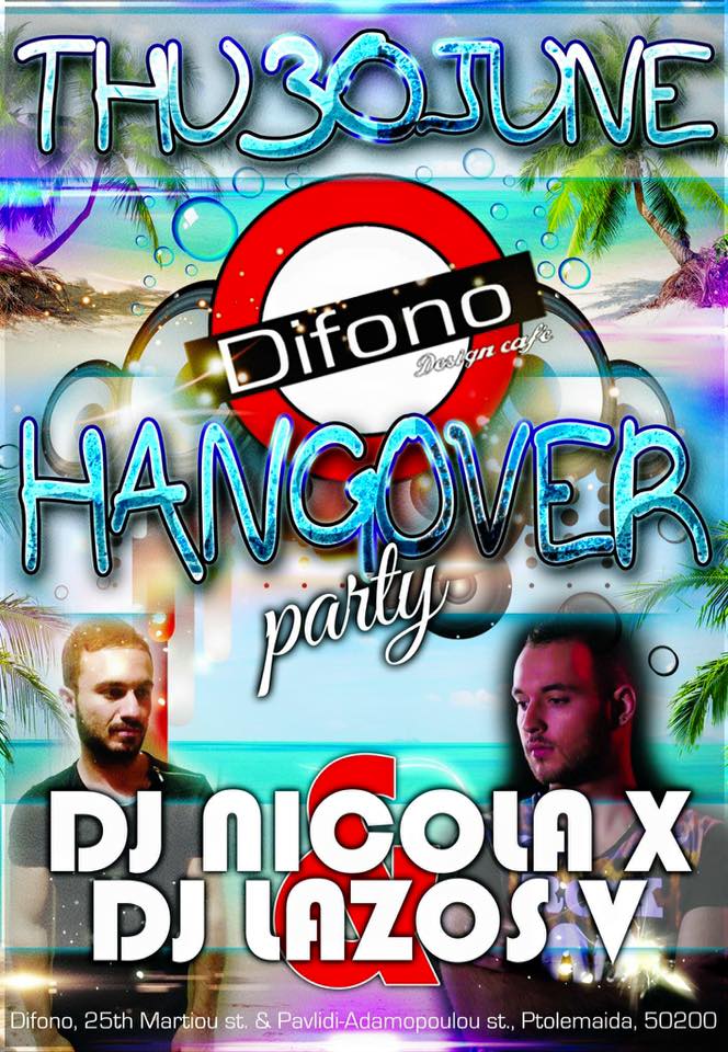 Hangover party στο Δίφωνο στην Πτολεμαϊδα με Dj Nicola X & Dj Lazos V, την Πέμπτη 30/6