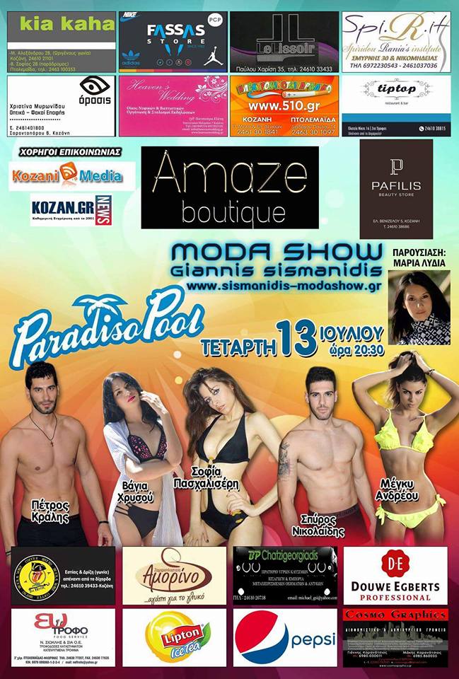 ΤΟ MODA SHOW ΔΙΟΡΓΑΝΩΝΕΙ MΙΑ ΚΑΛΟΚΑΙΡΙΝΗ ΕΠΙΔΕΙΞΗ ΜΟΔΑΣ ΓΕΜΑΤΟ ΛΑΜΨΗ ΟΜΟΡΦΙΑ Σ ΕΝΑΝ ΠΟΛΥ ΟΜΟΡΦΟ ΧΩΡΟ ΣΤΗΝ ΠΙΣΙΝΑ PARADISO POOL ΣΤΗΝ ΠΟΛΗ ΤΗΣ ΚΟΖΑΝΗΣ 13 ΙΟΥΛΙΟΥ ΗΜΕΡΑ ΤΕΤΑΡΤΗ ΚΑΙ ΩΡΑ 20.30 ΜΕ ΠΟΛΛΕΣ ΕΚΠΛΗΞΕΙΣ,ΜΕ ΤΗΝ ΣΥΜΜΕΤΟΧΗ ΤΩΝ ΚΑΛΥΤΕΡΩΝ ΜΑΓΑΖΙΩΝ ΤΗΣ ΠΟΛΗΣ