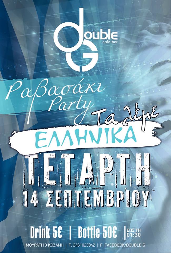 “Ραβασάκι party -Τα λέμε Ελληνικά” στο Double G στην Κοζάνη, την Τετάρτη 14 Σεπτεμβρίου .