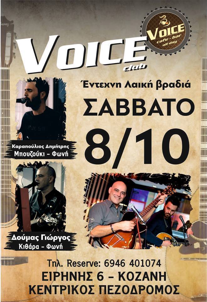 Έντεχνη Λαϊκή βραδιά στο Voice bar στην Κοζάνη, το Σάββατο 8 Οκτωβρίου .