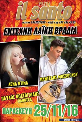 Έντεχνη Λαϊκή βραδιά στην πιτσαρία il Santo στην Πτολεμαΐδα, την Παρασκευή 25 Νοεμβρίου